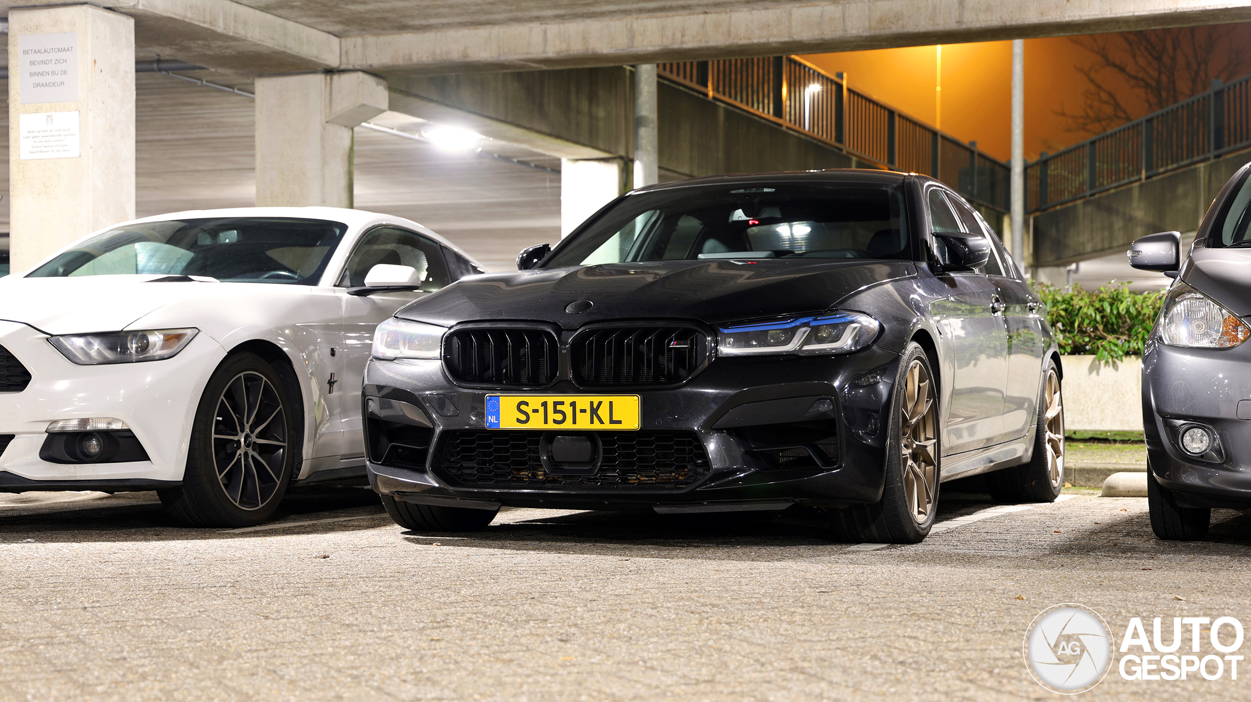 Ik had gehoopt een spot in de (dichte) mist te pakken, maar deze M5 Competition stond geparkeerd in de garage. Op de voorkant foto's is dan nog deels wat mist te zien. Leuk dat die naast de Mustang stond, twee totaal verschillende auto's naast elkaar!