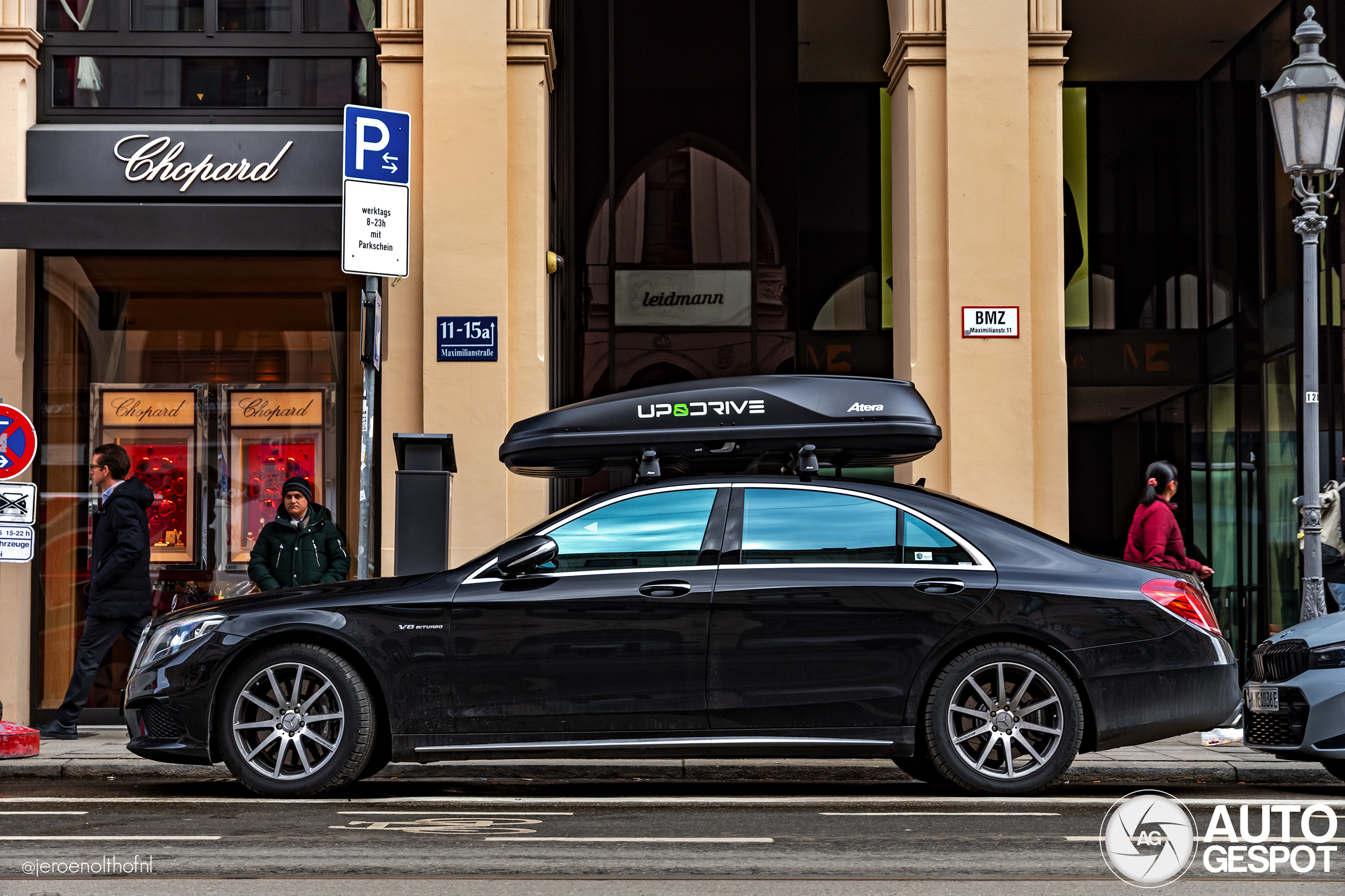 Bijzonder gezicht, zo'n koffer op een S-Klasse!