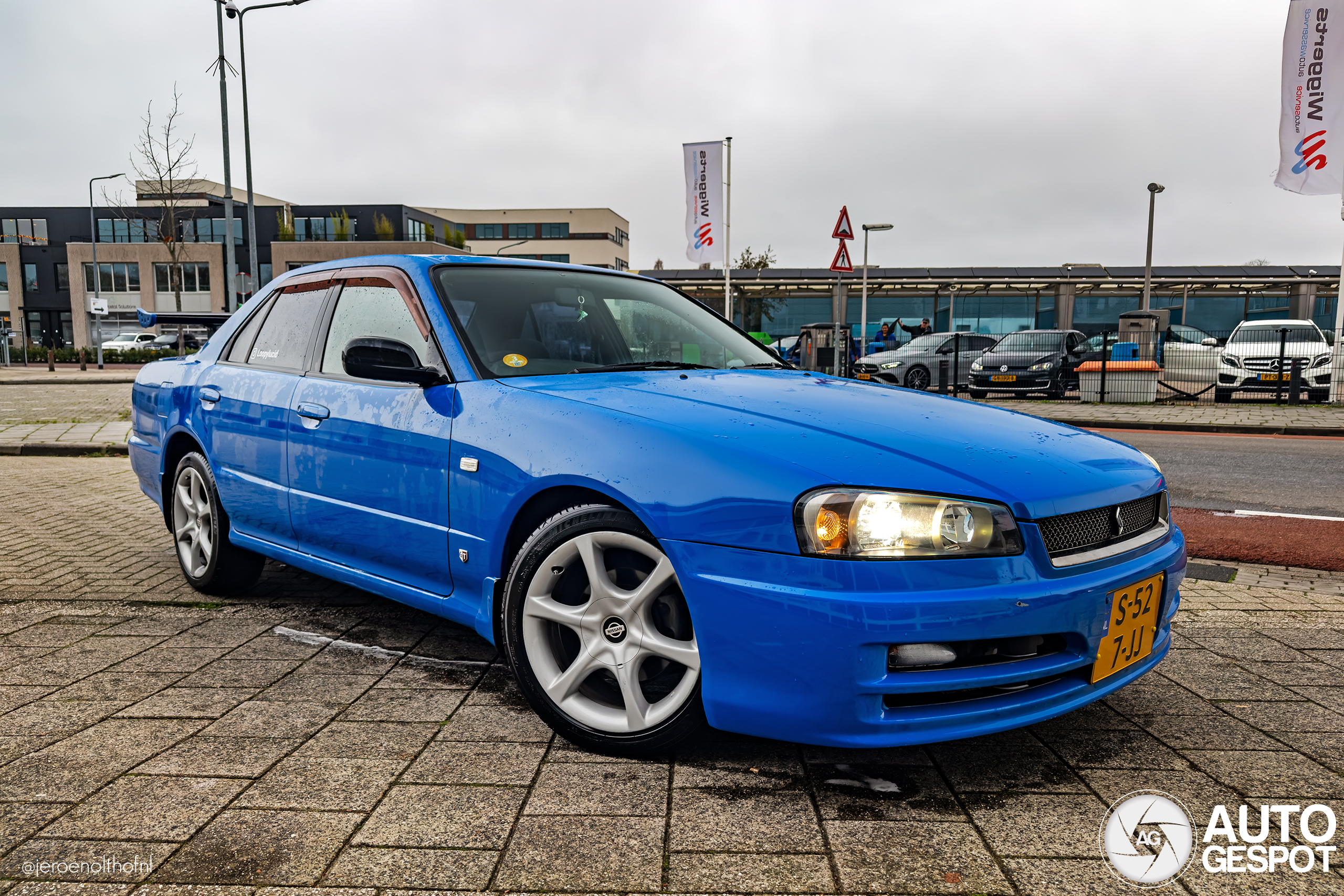 Persoonlijke primeur! First for me. Mobiele spot. Deze bijzondere Skyline kwam ik tegen bij de wasboxen toen de eigenaar hem net aan het wassen was. "Ik heb hem zelf geïmporteerd uit Japan. Hij is altijd van een oud mannetje geweest. Hij heeft nu 145.000 kilometer gelopen." Niet veel voor een auto die bijna 25 jaar oud is. Er werd in Japan niet veel mee gereden dus. Oorspronkelijk is dit exemplaar grijs, maar voor nu blauw gewrapt in een andere tint blauw dan de R34 GT-R. Zo'n Sedan-uitvoering heb ik nog niet eerder gezien.